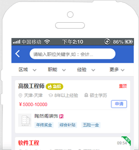 - 無需下載,沒有平臺、機型的限制,有觸屏手機就能上網(wǎng)找工作!機會不再稍縱即逝,它已在你輕盈的指尖上!